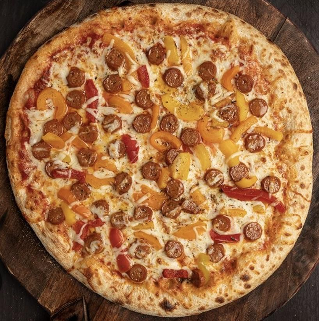 Pâte à pizza rectangulaire, sauce tomate, champignons, oignon, poivron, merguez, fromage, olive noire, origan.